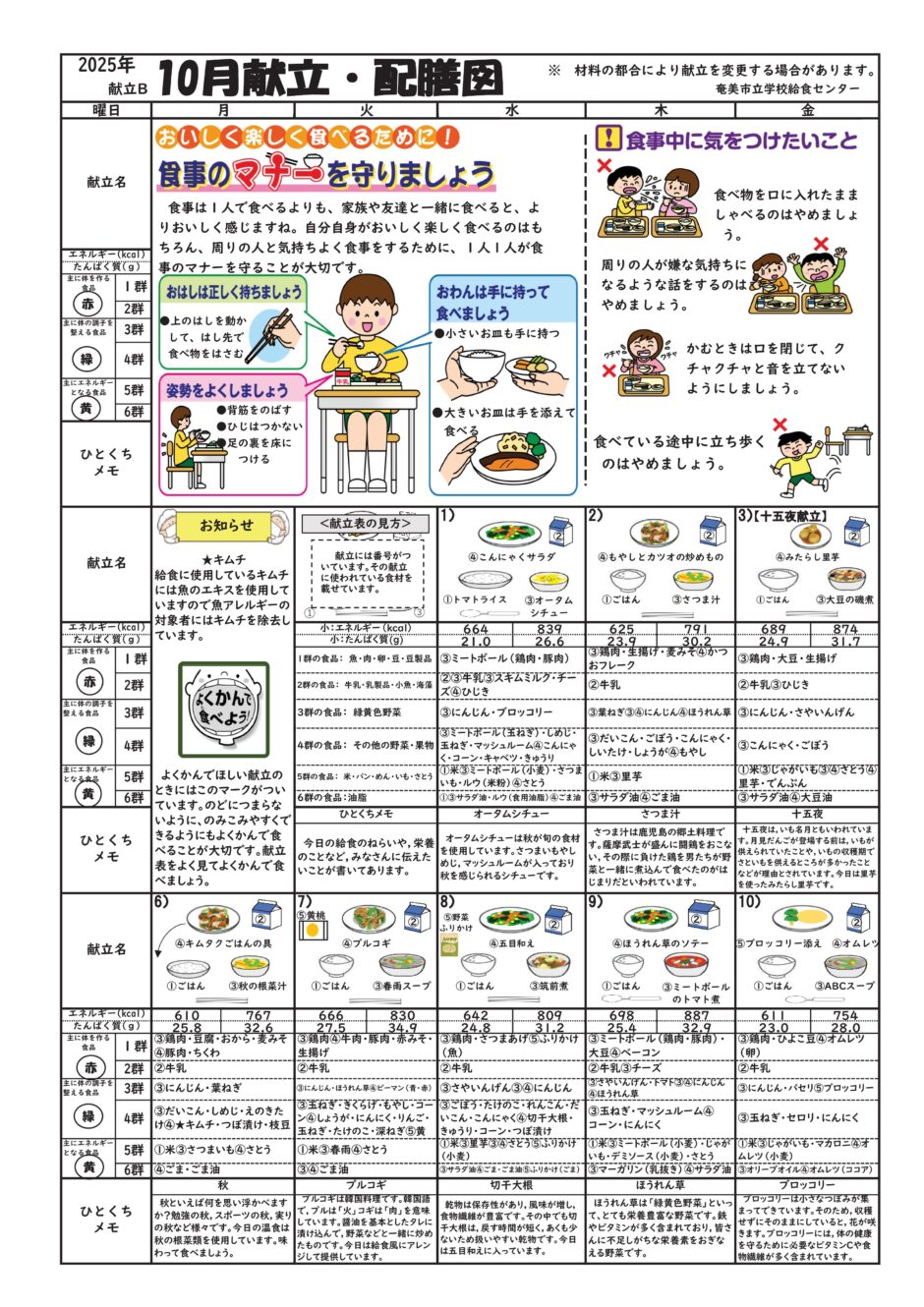 奄美市立学校給食センターより10月のB献立と給食だよりの配信です。 給食だよりでは、貧血を防ぐための食生活のポイントについて掲載しています。 ぜひ読んでみてくださいね。