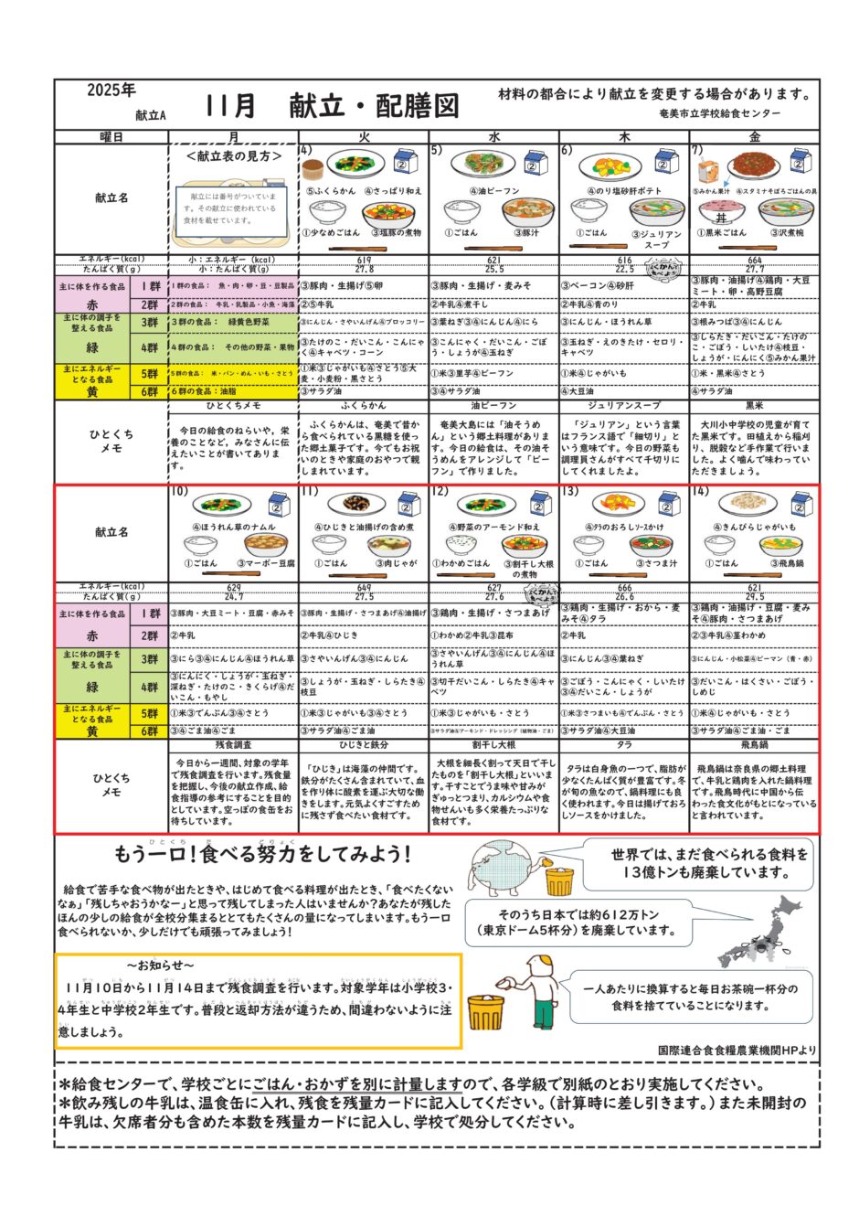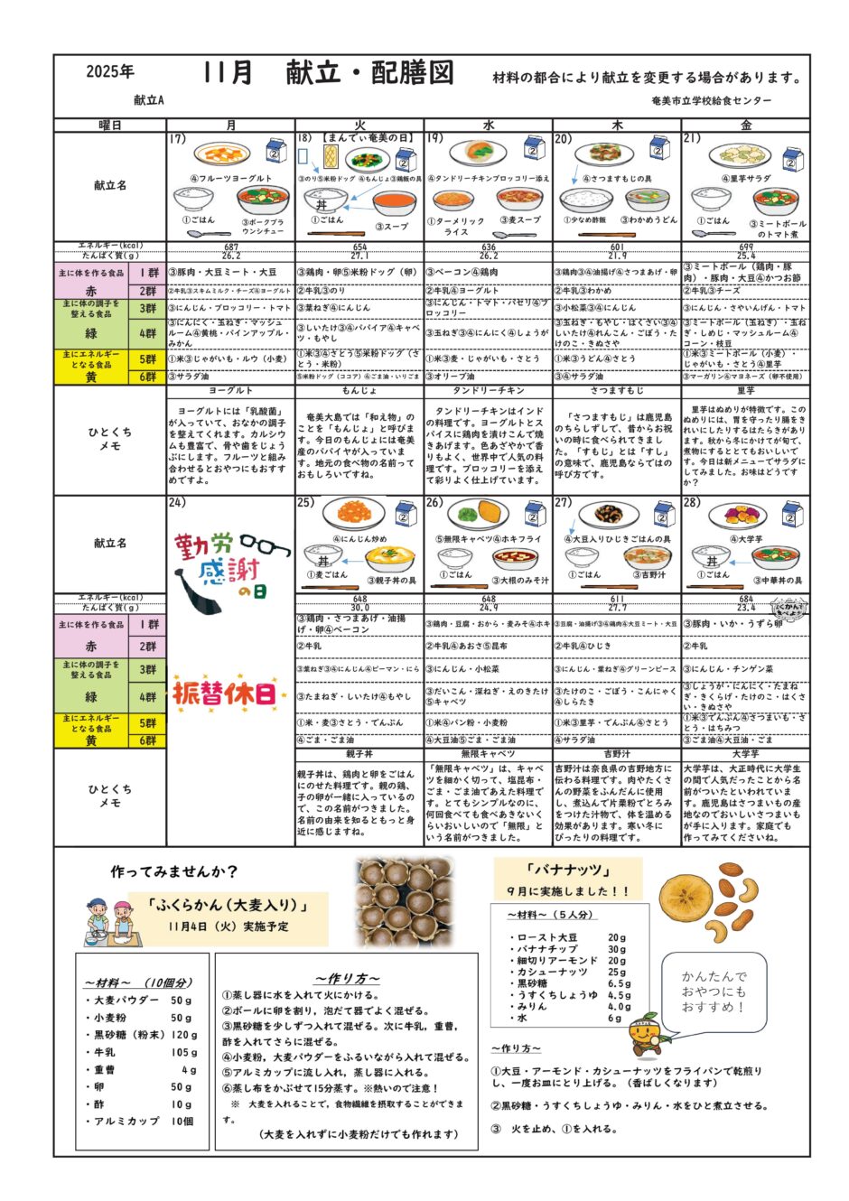 奄美市立学校給食センターより11月のA献立と給食だよりの配信です。